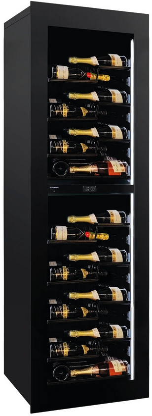 Cette armoire à vin est destinée a être encastrée dans un meuble de cuisine. Elle possède deux zones de température et peut accueillir jusqu’à 72 bouteilles réparties sur des clayettes coulissantes en bois et délicatement révélées par un éclairage intérieur. La porte est entièrement vitrée et traité anti-UV.