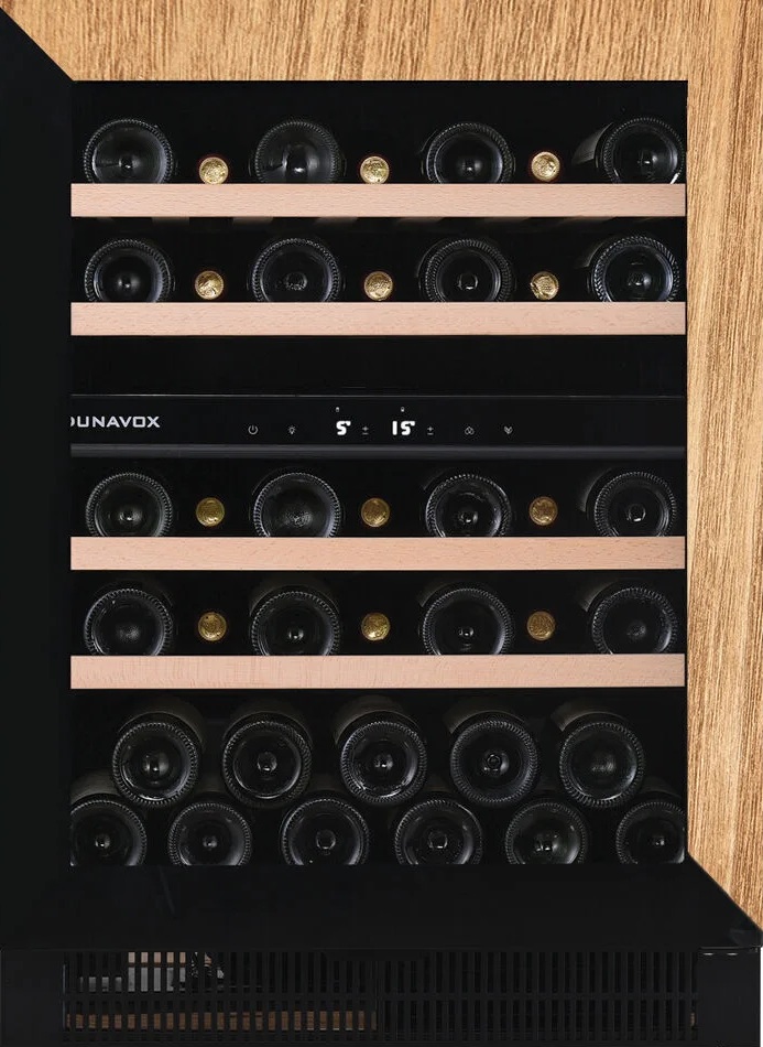 Cette armoire à vin de service est dotée de deux zones de température pouvant accueillir jusqu’à 39 bouteilles. Elle a été conçue pour être encastrée sous un plan de travail ou en pose libre.